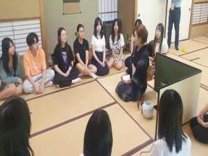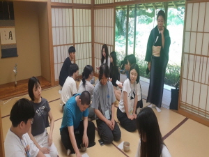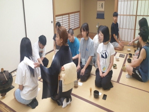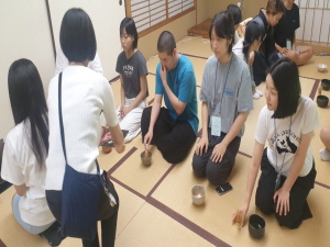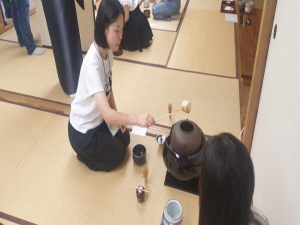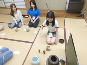日本茶道体験。2組に分けて交代に体験。 | 日韓伝統遊び(ジェギチャギ、コンギノリ、けん玉)、参加感想文作成 |