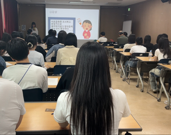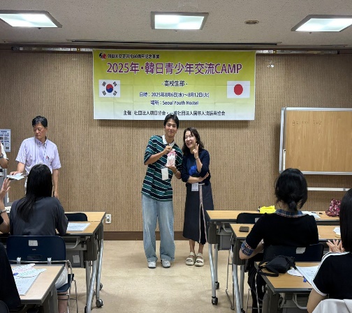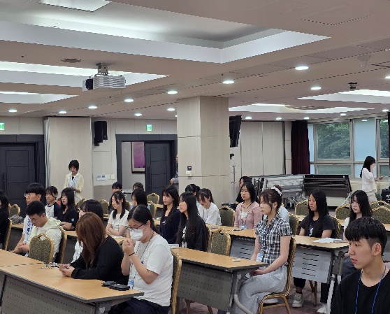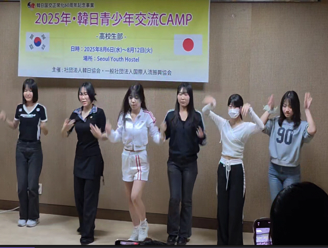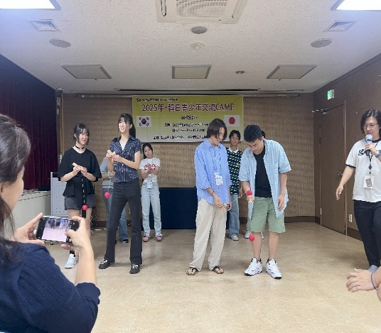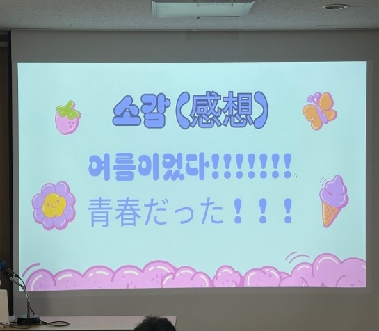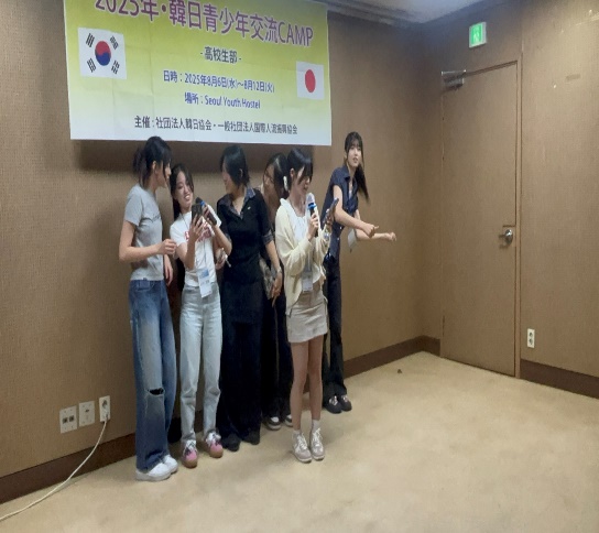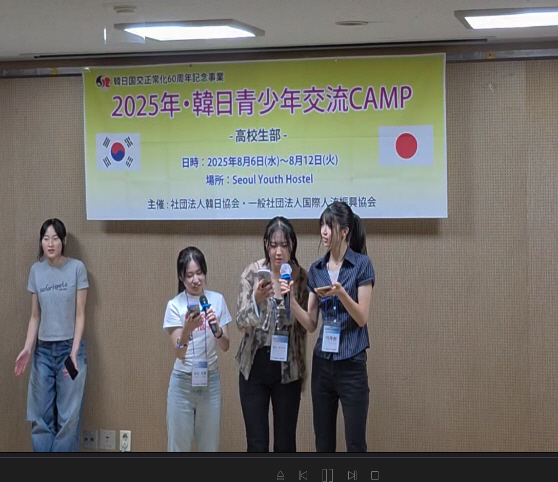 | 8/7(木) | 韓国人学生全員共通テーマの発表。事前にテーマ及び参考資料を提供。両国の学生全員が発表を聞き質問。韓国優秀学生3人選抜授賞。 | 8月11日に予定されているダンス&歌コンテストの練習をグループごとに行います。 (事前に提出された申請内容を参考にします) |